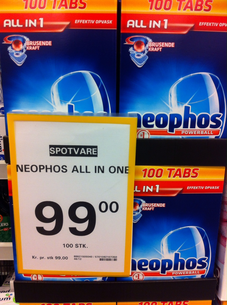 Var lige et smut forbi Netto i går for at klare den kommende uges indkøb. I den forbindelse blev jeg rimelig forundre over, at det kan lade sig gøre for Netto at have 5 forskellige priser på Neophos All in 1 opvasketabletter. Det er måske lige i overkanten, da en ikke helt vågne forbruger kan blive snydt?